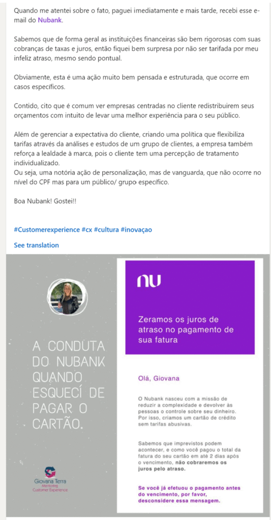 Este exemplo do Nubank ilustra lindamente uma Estratégia de CX em ação. Uma cliente compartilhou um post emocionado expressando sua admiração pelo banco após uma interação surpreendente e empática. Ela havia perdido o prazo de pagamento do cartão de crédito, quitou o valor atrasado e se preparou para arcar com os juros. Mas, em vez de receber uma cobrança genérica, o Nubank enviou um e-mail personalizado, isentando os encargos e reconhecendo seu esforço.